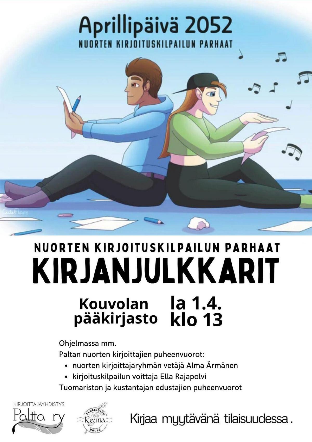 Kirjan julkistamistilaisuus onaprillipäivänä1.4.2023 klo 13 – 14 Kouvolan kirjastossa. Tilaisuudessa kilpailun voittaja Ella Rajapolvi Nurmijärveltä ja Paltan nuorten kirjoittajien ryhmän koordinaattori Alma Ärmänen Haminasta kertovat kirjoittamisharrastuksestaan. Paikalla ovat myös Paltan, tuomariston ja kustantamon edustajat.